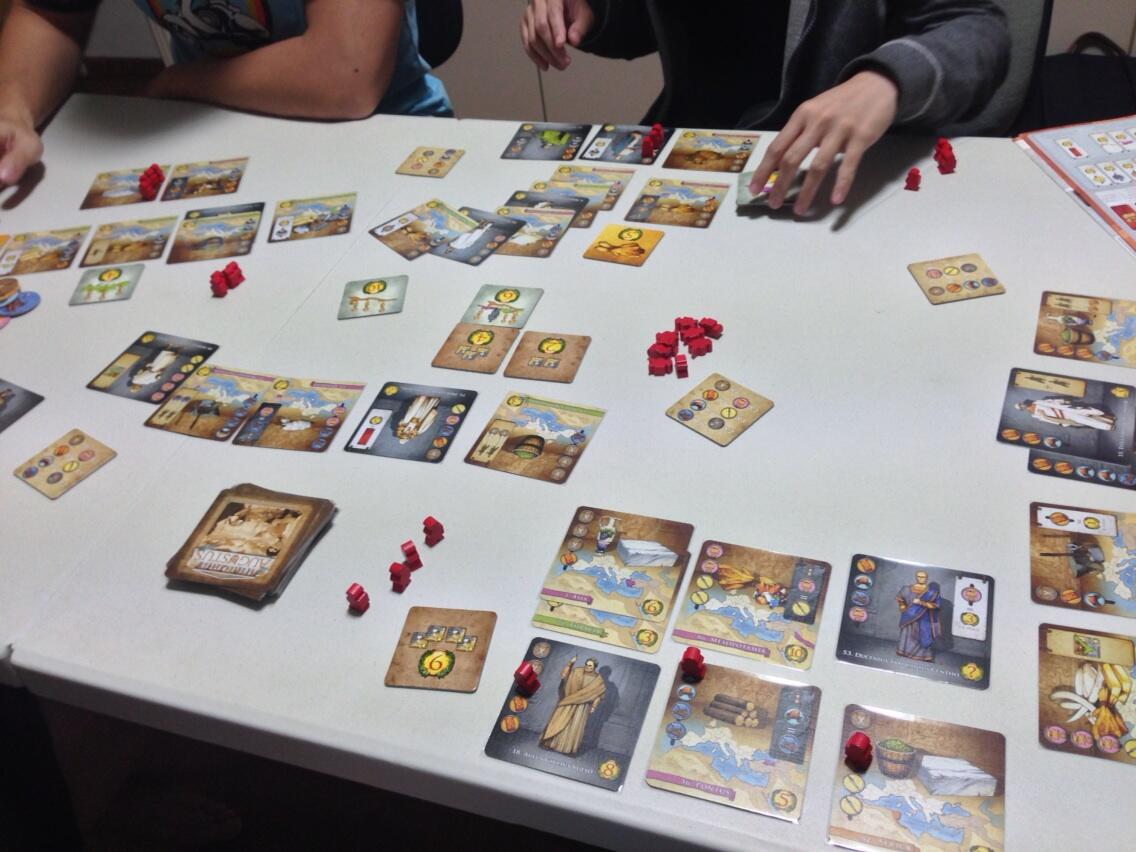 Augustus is a light euro? (american? Jury is still out on this) style game where players are competing the score the most points completing symbols on objective cards and also fighting for a common set of achievements. The game will end when 1 player has completed 7 objectives and players count their end game scoring tiles and whoever has the most points will win the game.