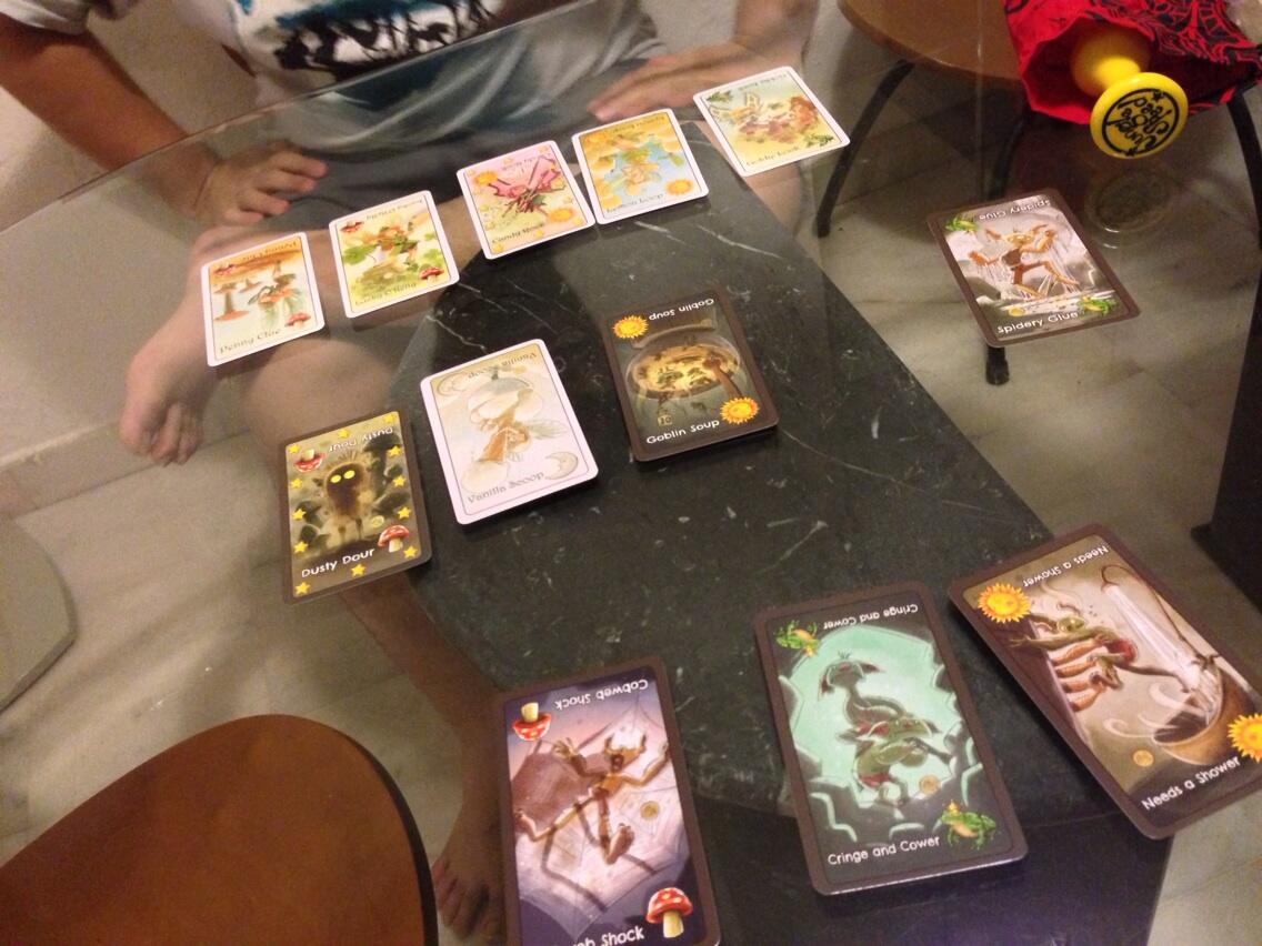 Art is certainly very nice and there are very witty and interesting names in the game. The rhyming bit though can get a whee bit tedious and confusing even though the instructions do tell you what the available rhymes are. They could have though provided colors to the words so we can quickly tell which cards rhyme and help us to determine what cards to play.